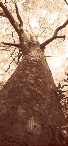 100人100色の人や情報を示します。人や情報が網羅し、その力が結集して表面に出たときに一本のまっすぐな樹になっています。一本の立派な樹は、それらが支えており力強くそびえ立っています。