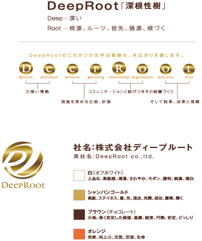私たちディープルート社のネーミングは、このような考え方をベースに「樹」を象徴とし、その全体図をモチーフ化しネーミングとしております。
