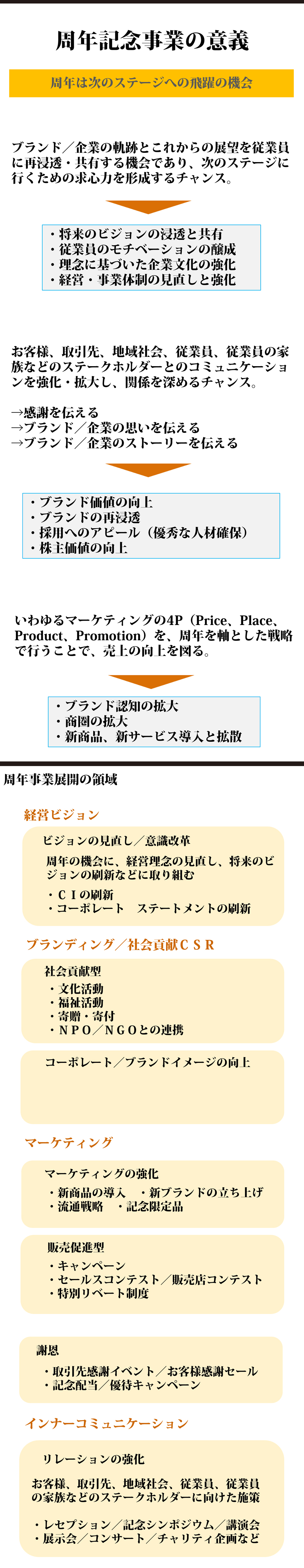 起業してから3年以内に約70%の企業が倒産すると言われる中、事業継続している企業様は、ステークホルダー様との良好な関係を築けていることでしょう。「周年・記念・プロジェクト」は、それらステークホルダー様への感謝の機会としてはもちろんですが、物語で言うところの一つの「章」という節目でもあります。物語は上向きのことばかりでは成立しません。次のチャプターに行くにあたり、今までの歴史を躓いたことも含めて振り返ることで、飛躍のヒントを見出すことです。ディープルートは、足跡を残すお手伝い致します。