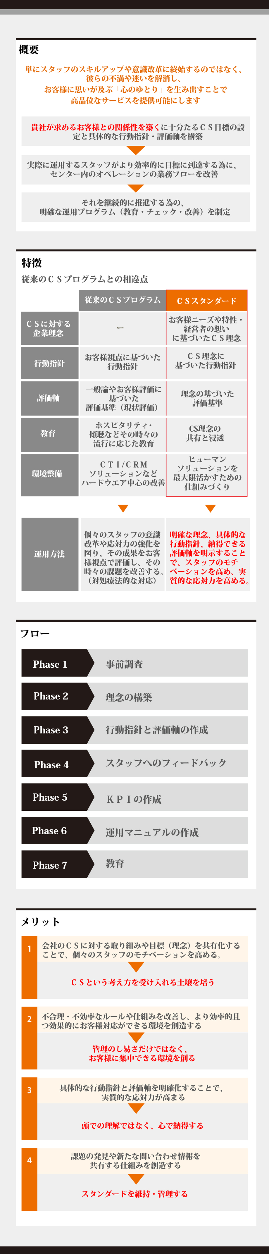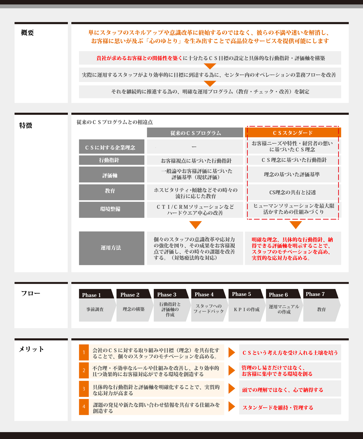 従来のお客様視点を超えた、CSに対する独自の品質基準と、それを実現する為の運用プログラムです。
