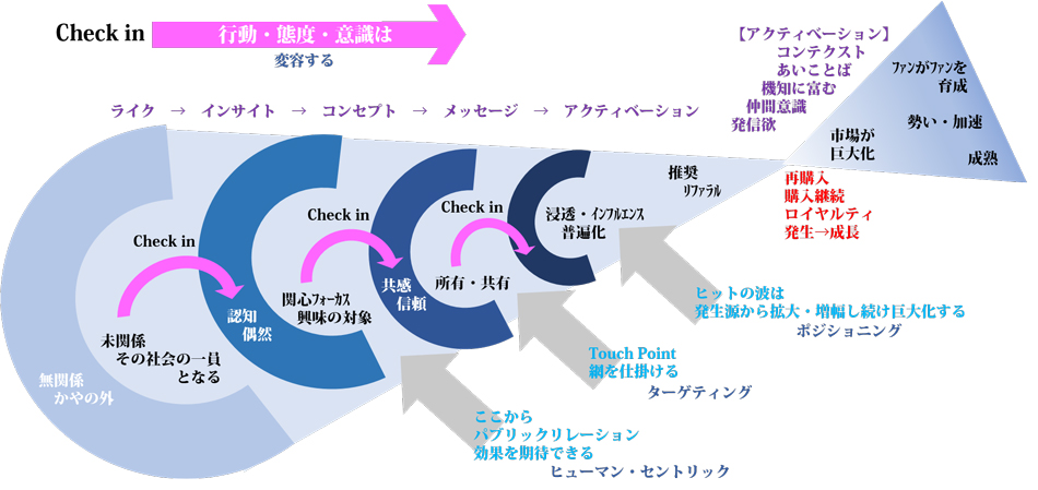 ディープルートの考えるCRM(カスタマー・リレーションシップ・マネジメント)は「顧客」の意識・態度変容を的確に捉え、戦略的に仕掛けるところから始まります。次にロイヤルユーザーが牽引する市場の拡がりに、さらに勢いをつける上で重要な役割を果たすキーワード、仲間として認め合っているからこそ理解し得る機知に富んだ合言葉を探究・導出し、拡散の加速化を狙います。