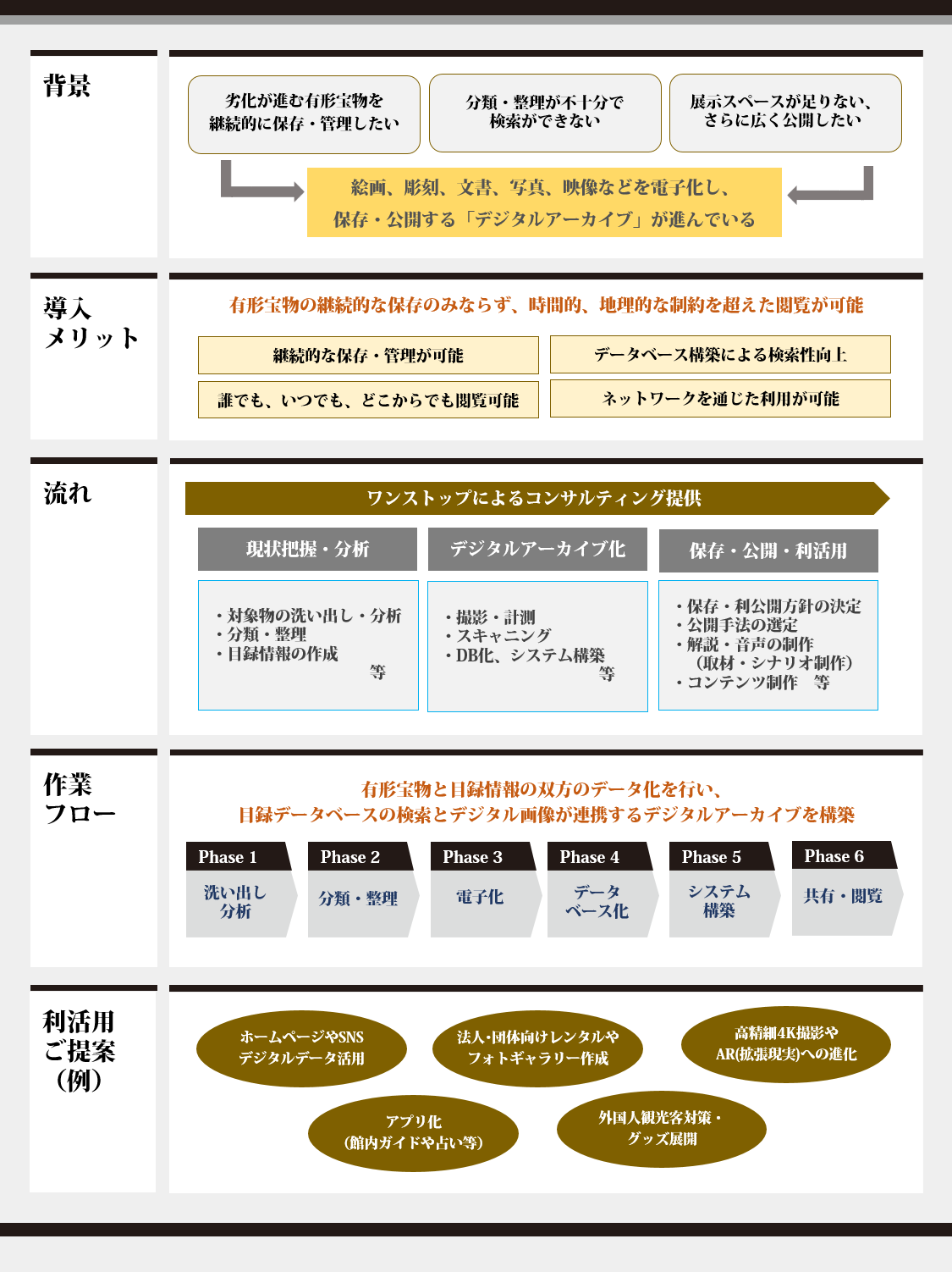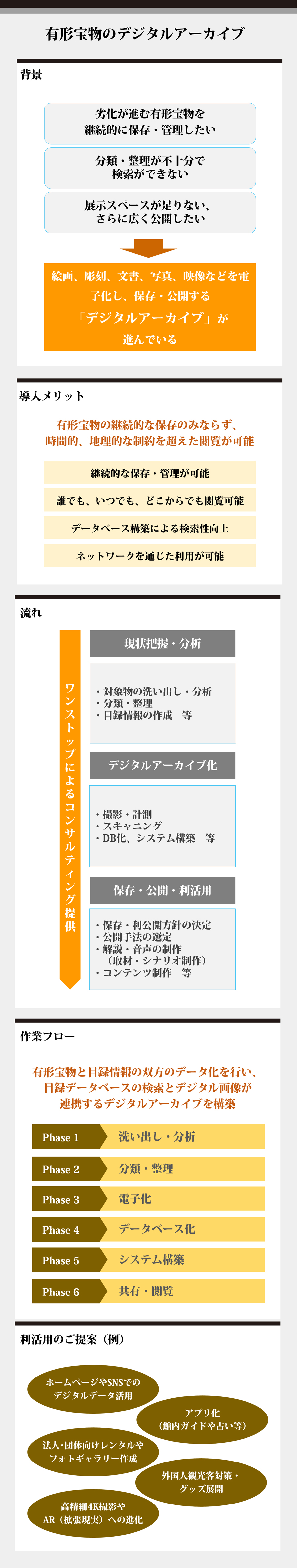 有形宝物の洗い出しから利活用案のご提示までワンストップでご提供します。